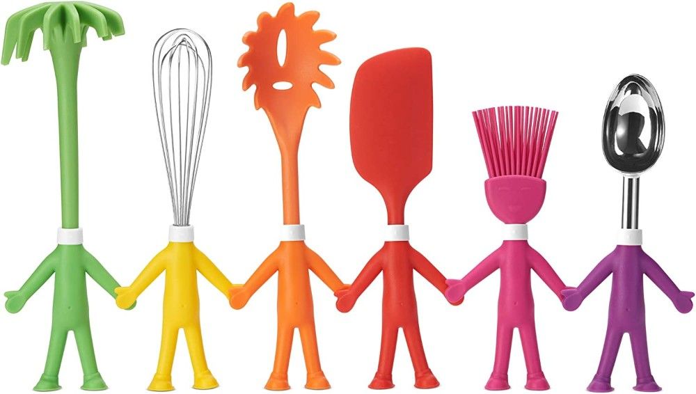 The set includes one slotted turner, pasta server, skimmer, soup ladle, spoon, and fork. All the surfaces of the utensils are seamless, so they're easy to clean and maintain. Just pop them in the dishwasher after usage.