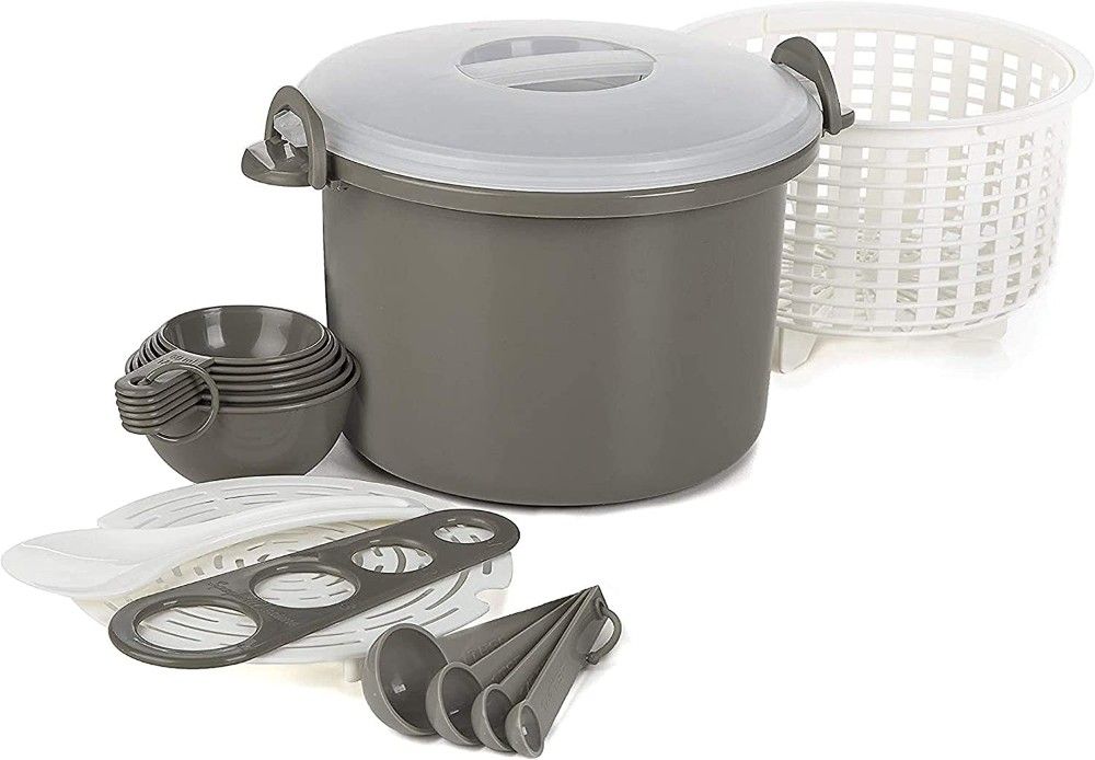 The cooker set comes with a 12-cup microwaveable rice & pasta cooker, pasta basket, pasta measuring tool, steaming tray, set of 4 measuring spoons, set of 6 measuring cups, and rice paddle. Plus, the locking handles to keep the lid securely in place while cooking. Pop everything in the dishwasher for easy cleanup.
