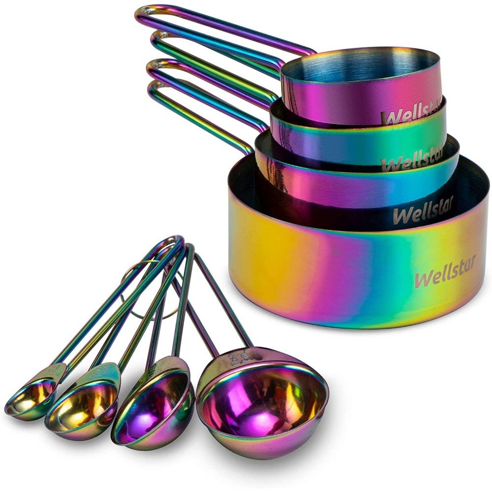 This set includes all the standard sizes, from 1/4 cup to 1 Tbsp, plus a handy 1/4 tsp and 1/2 tsp. The cups and spoons are rust-resistant, lead and cadmium free and safe for dry and liquid ingredients. The rainbow titanium coat provides a non-reflective, corrosion-resistant finish that looks great in any kitchen.