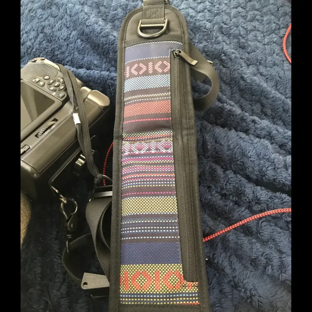 There are two plastic buckles on the strap to position your camera and prevent it from sliding, and a zippered pocket allows you to store small accessories for quick access.