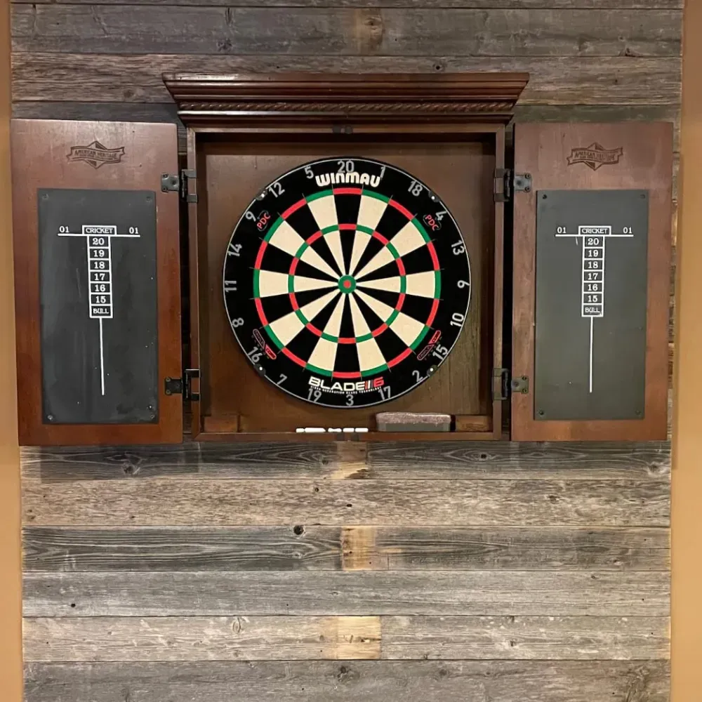 The stylish mount cabinet includes two chalk dart scoreboards, built-in dart holders for up to six darts, and hanging hardware. This setup not only enhances your game room's aesthetics but also provides a convenient and organized playing area.