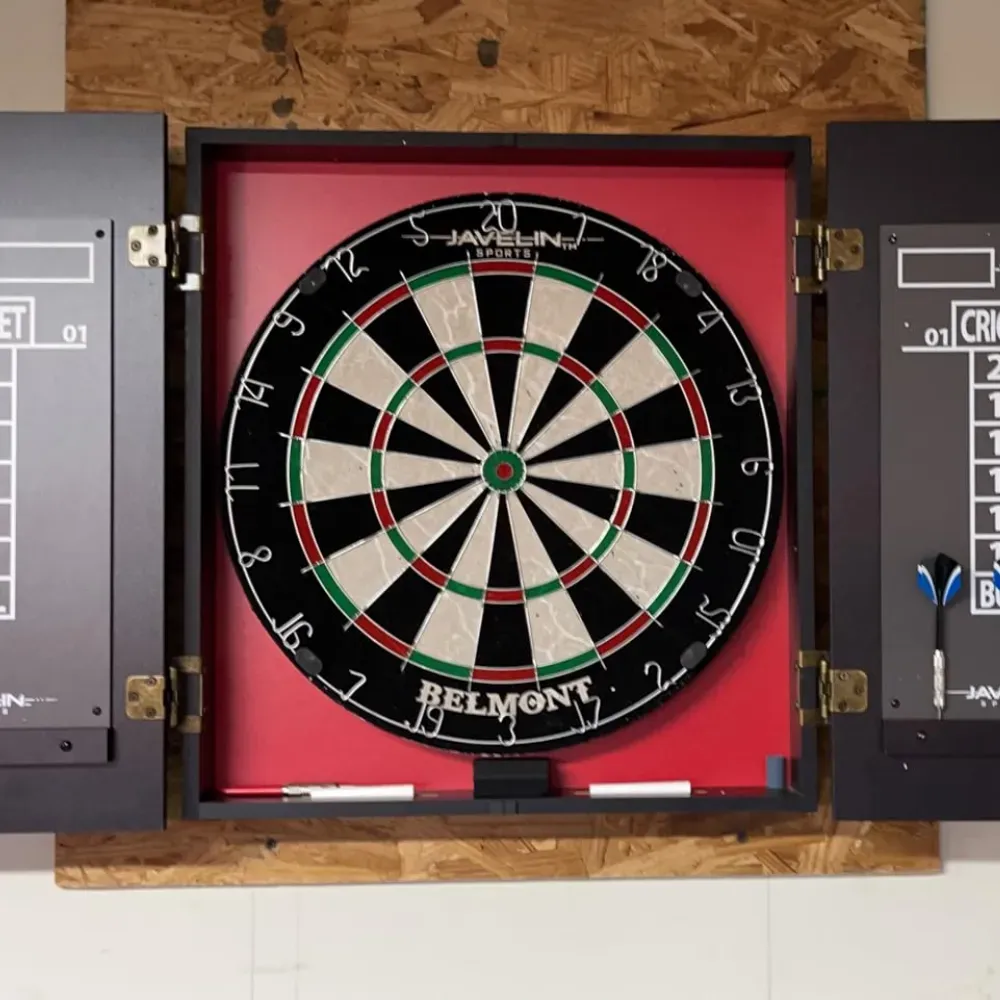 The included accessories, such as the steel-tip darts and dry-erase scoreboards, make setup a breeze. The cabinet's black felt lining and compact door stoppers protect both the dartboard and the cabinet, ensuring they remain in excellent condition for a long time.
