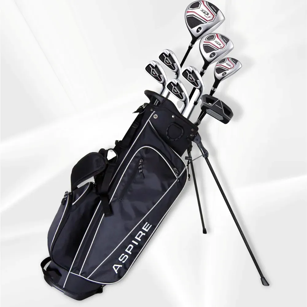 The Aspire XD1 set comes loaded with everything a budding golfer needs to step up their game. It includes a Driver, Fairway Wood, Hybrid, 7-PW Irons, Putter, Stand Bag, and 3 H/C's, providing a comprehensive golfing solution.
