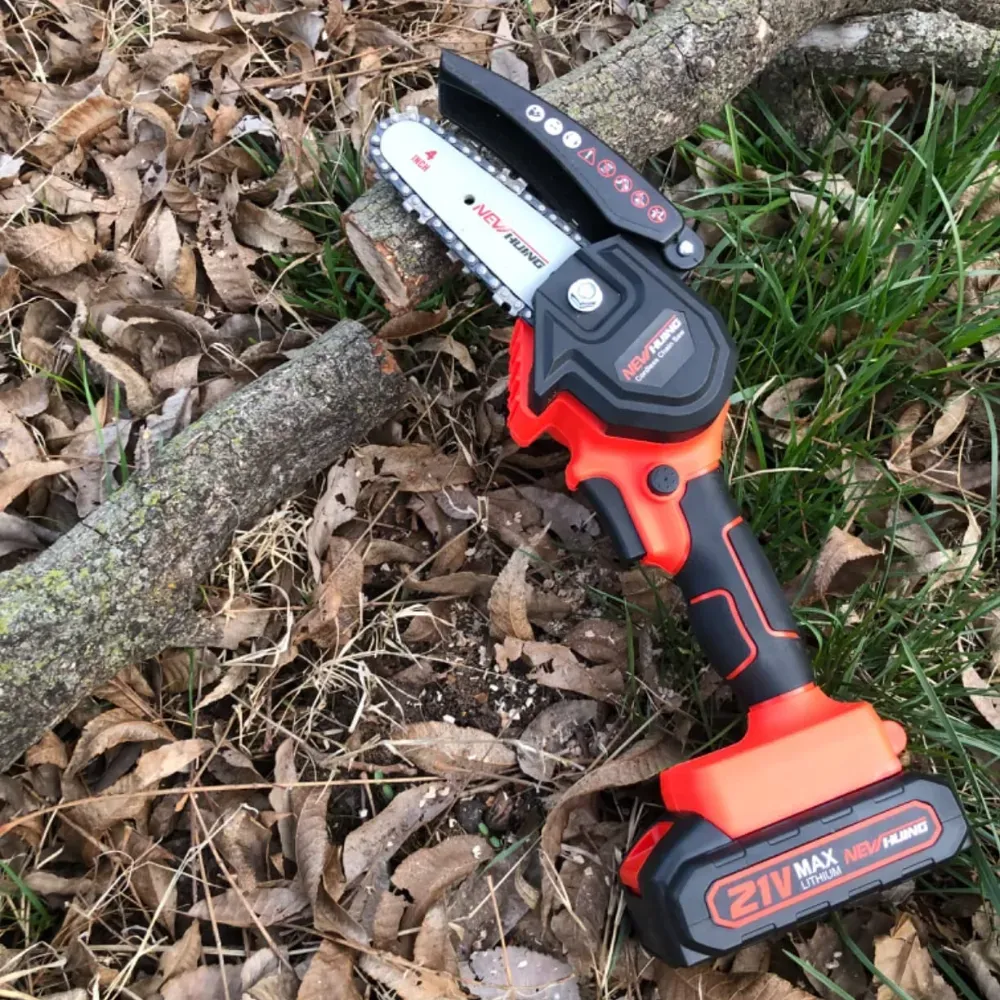The New Huing Mini Cordless Chainsaw Kit is an upgraded, one-hand-operated chainsaw that offers convenience and efficiency for tree trimming and branch wood cutting.