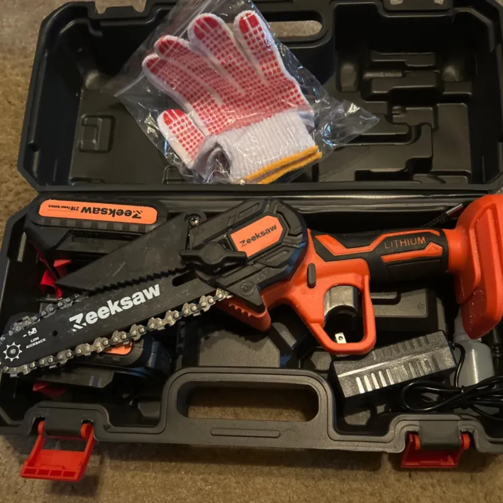 The Zeeksaw Mini Chainsaw 6 Inch Cordless is a robust handheld chain saw that promises super power and efficiency. Its design is tailored for cutting tree wood and tackling outdoor tasks with ease.