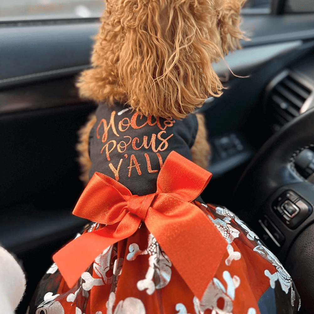 The dress features all-over signature Halloween colors with pretty tulle filled with skeleton patterns and iron-on glitter letters “Hocus Pocus Y'all” with an elegant bowknot on the waist.