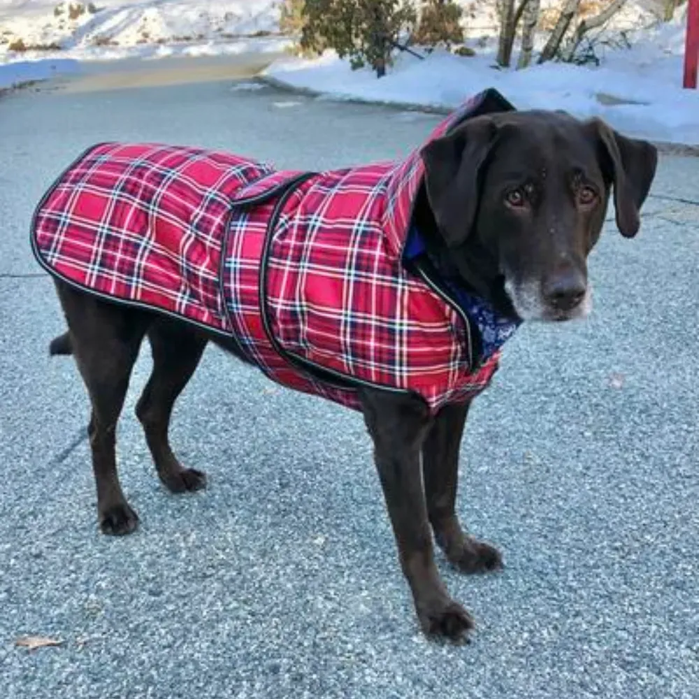 "Our Bagel is the star of the neighborhood in her new red plaid coat. It's sturdy, seems waterproof or resistant and warm. Love the way it closes and that it gives good belly coverage. Great buy. Need to get a photo!"