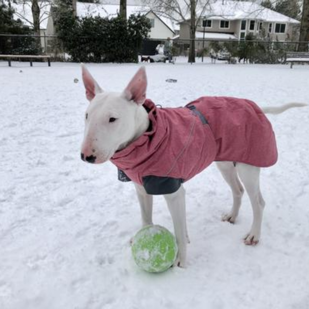 "We're really satisfied with this coat's performance on the coldest of New Hampshire days. It's quick and easy to put on, doesn't restrict our dog's front leg movement, and stays put. It's a bonus that we have easy access to the clip for her harness. Terrific dog coat!"