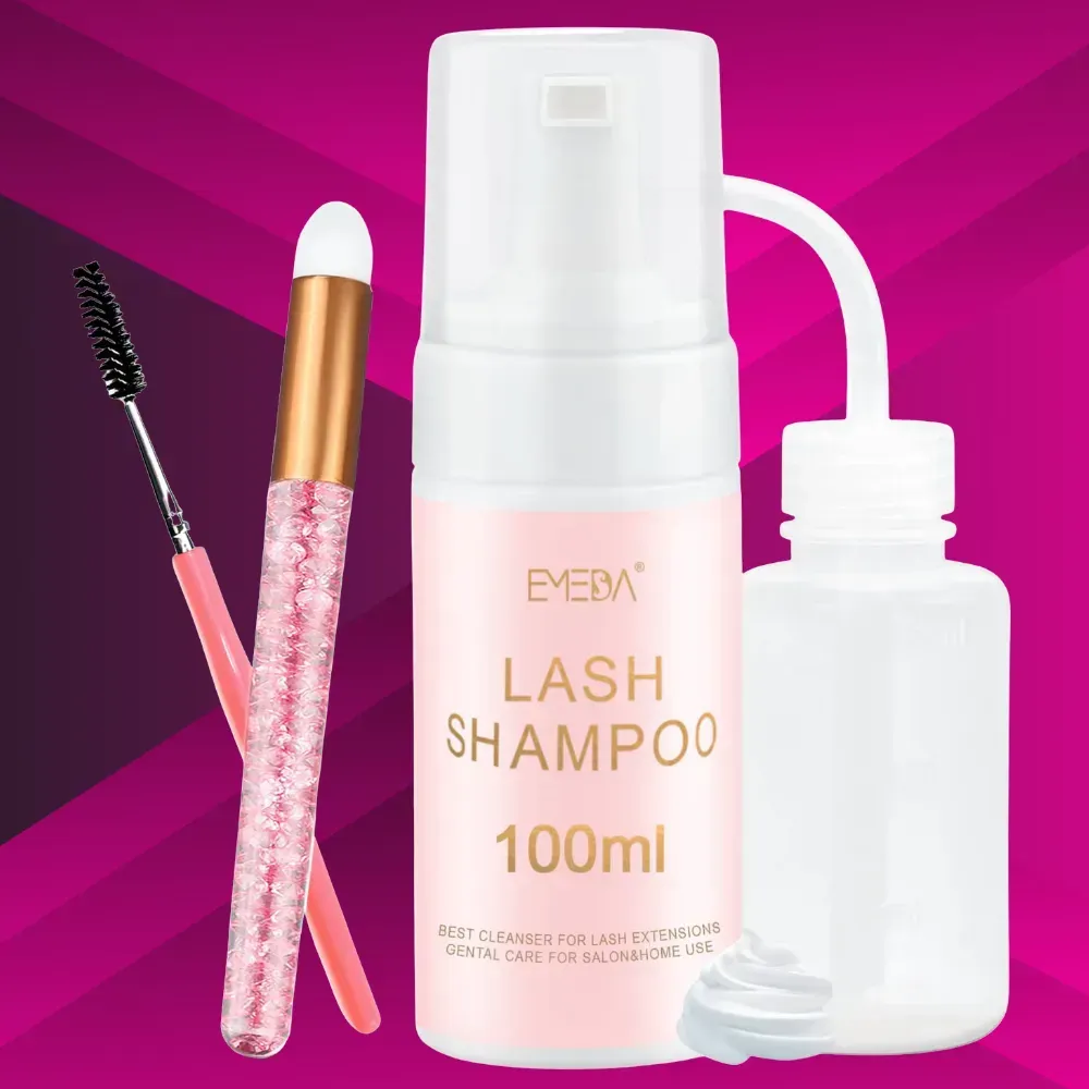 This kit includes a 100ml/3.38oz shampoo bottle, a 150ml foam lash shampoo bottle, a crystal handle, and a soft head eyelash shampoo brush.