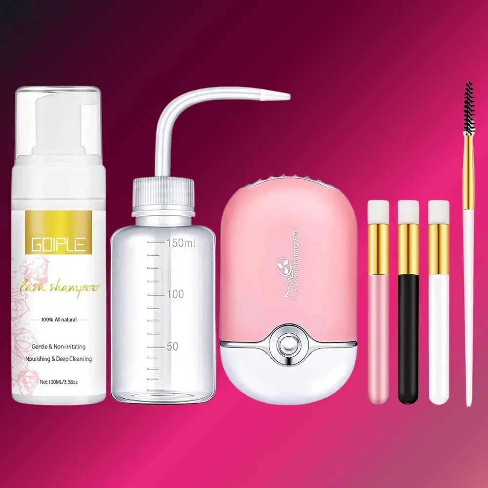 This fantastic set comes with 100ml rose scent lash shampoo, 3 cleansing brushes, 1 mascara brush, 1 bottle, and 1 USB mini portable fan.