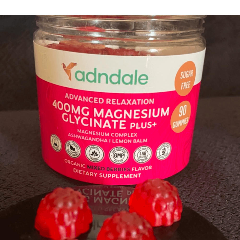 Adndale Magnesium Glycinate Gummies provide a triple magnesium complex combining magnesium glycinate, magnesium malate, and magnesium taurate for comprehensive relaxation. With added ashwagandha and lemon balm, these gummies are perfect for stress relief and muscle recovery.