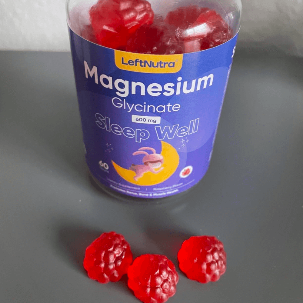 LeftNutra Magnesium Glycinate Gummies combine two powerful forms of magnesium: magnesium glycinate and magnesium L-threonate. Together, they offer 600 mg of magnesium per serving to support muscle, nerve, and bone health. These gummies help relieve stress, improve sleep, and boost overall wellness, making them an essential dietary supplement for daily use. Plus, the natural raspberry flavor ensures a delicious experience with every chew.