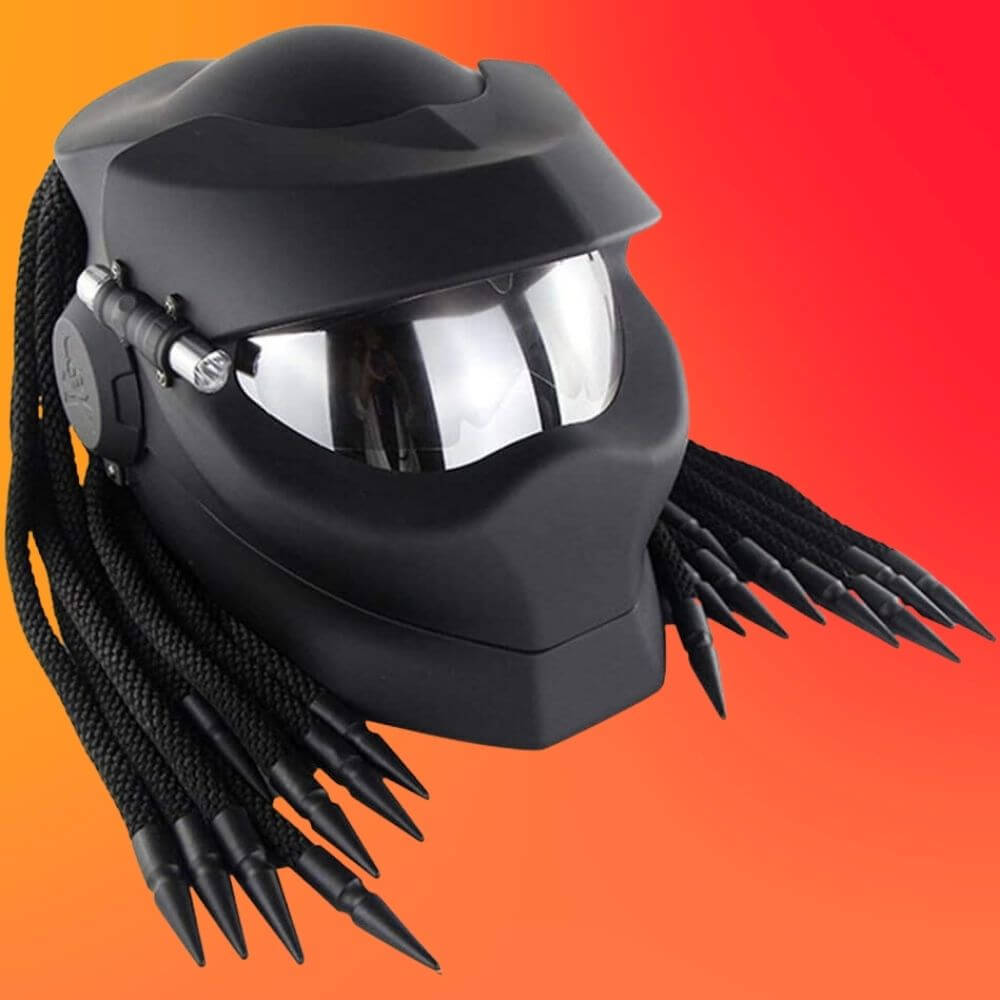 The Robot Motorcycle Helmet, Revealable Lens Motorcycle Full Face Helmet is a great choice for all seasons, featuring a very cool and personalized predator design. It is made of an ABS outside shell and an EPS inner shell, making it lightweight yet safe and secure. It also has a wide peripheral vision, so you can see everything on the side, and the inside padding is very comfortable. The helmet also features an adjustable chin strap (quick release strap), removable earplugs and is DOT approved for safety standards.