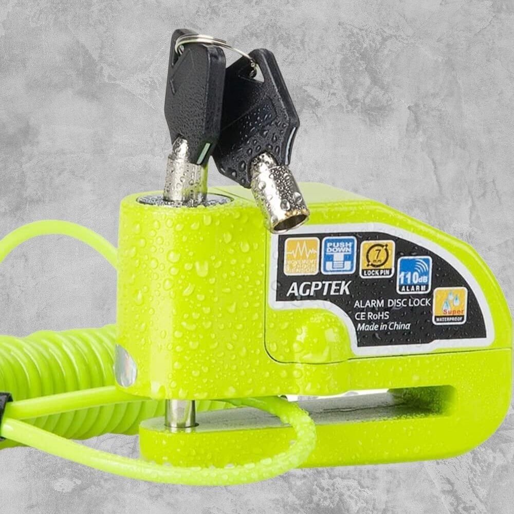 The AGPTEK Disc Lock Alarm with 5FT Reminder Cable is the perfect security measure for your motorcycle or bike. It automatically activates upon sensing any vibration or shock, emitting an audible 110db alarm that is loud enough to discourage any would-be thief. The bright green color and the reminder cable helps let the would-be thief know that the motorcycle/bike has safety measures installed. Plus, the reminder cable can be stretched up to 5.2FT and can make sure that you don't forget to remove the motorcycle disc lock before trying to ride.