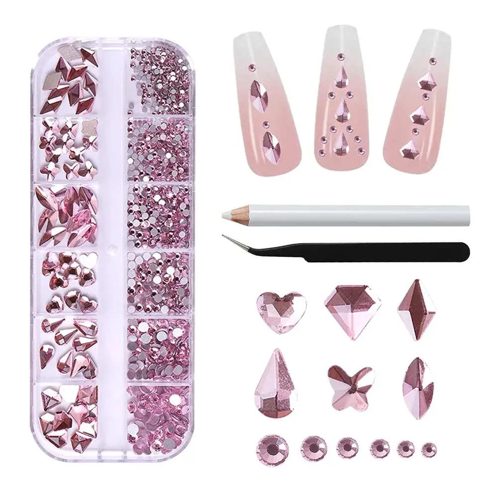 This set includes 1000 round crystals per box, 6 sizes, and 10 nail rhinestones per style, such as teardrop, butterfly, oval, diamond, heart, etc.