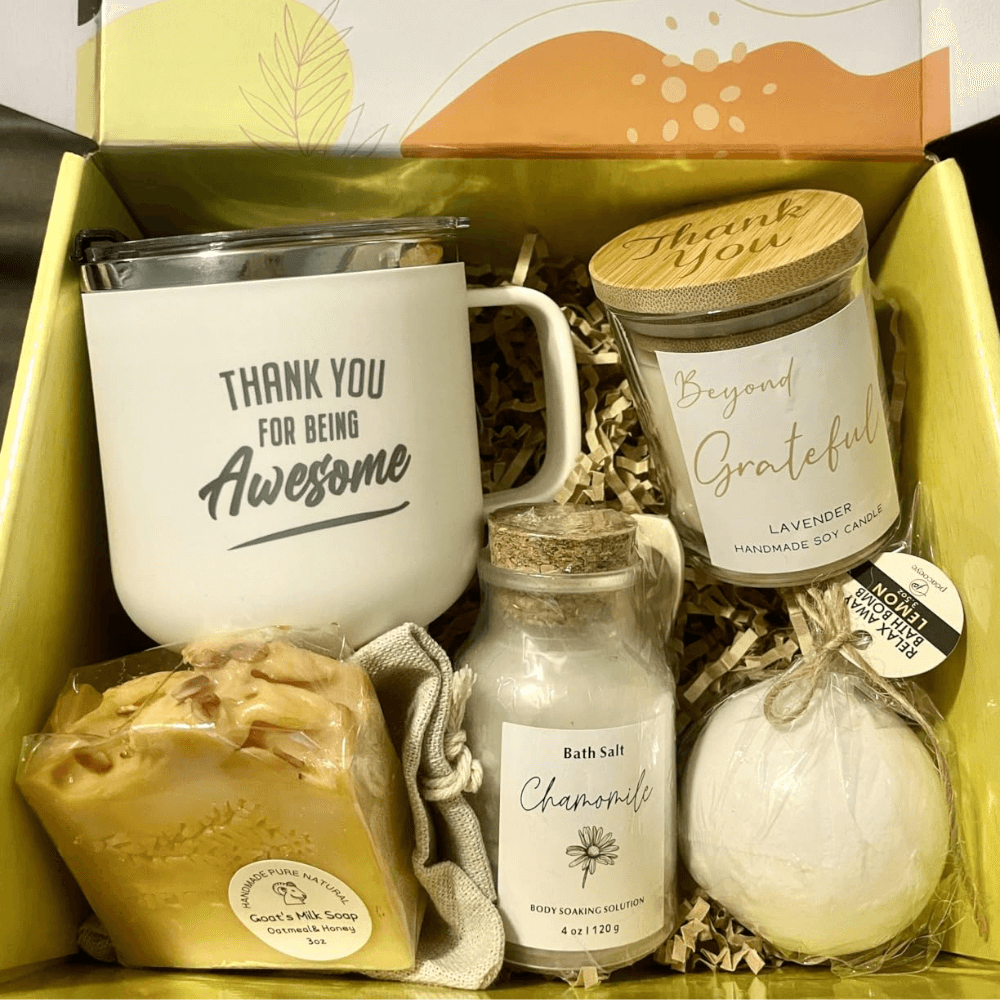 Show your appreciation with this beautifully curated Thank You Gift Set, featuring a 10 oz stainless steel tumbler, scented candle, bath essentials, and a heartfelt thank-you card. Thoughtfully packaged and ready to impress, this gift box is a great way to express gratitude in a memorable way.