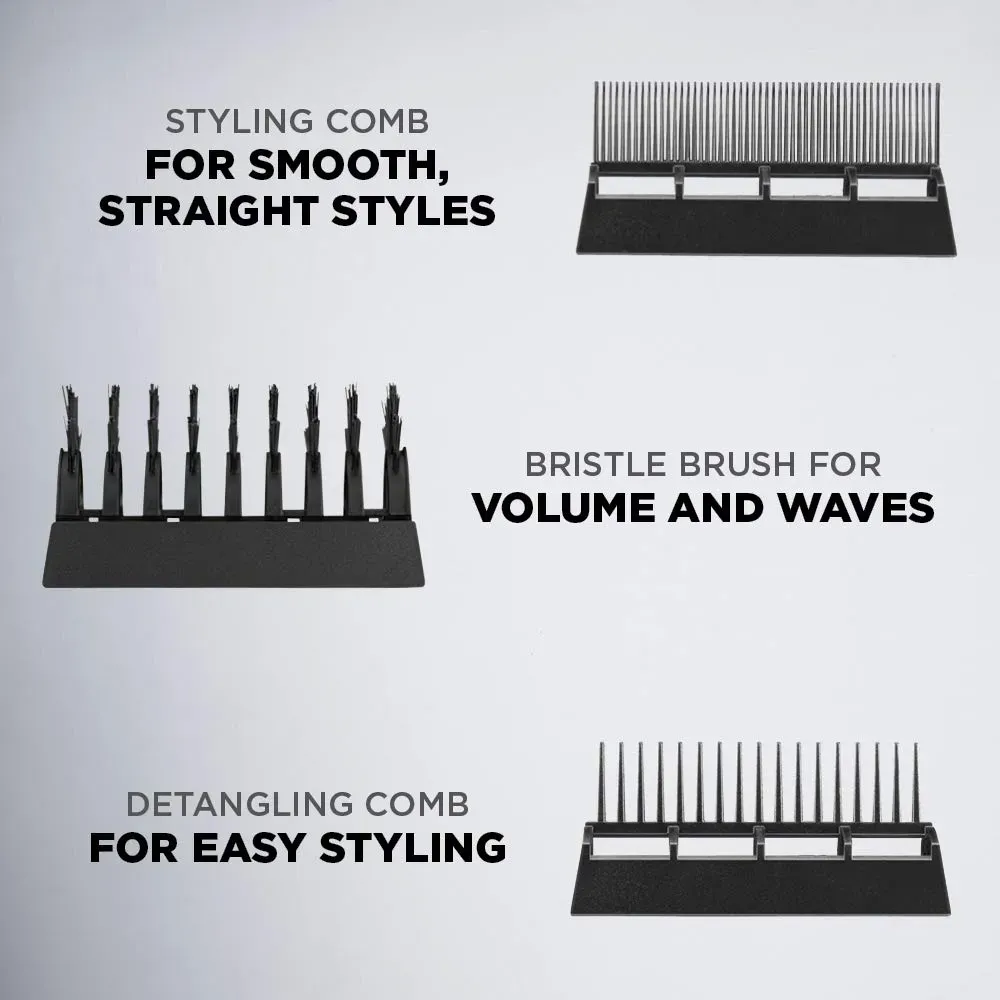 This versatile styler comes with three attachments – a thermal bristle brush attachment for volume and waves, a styling comb for straight styles, and a detangling comb.