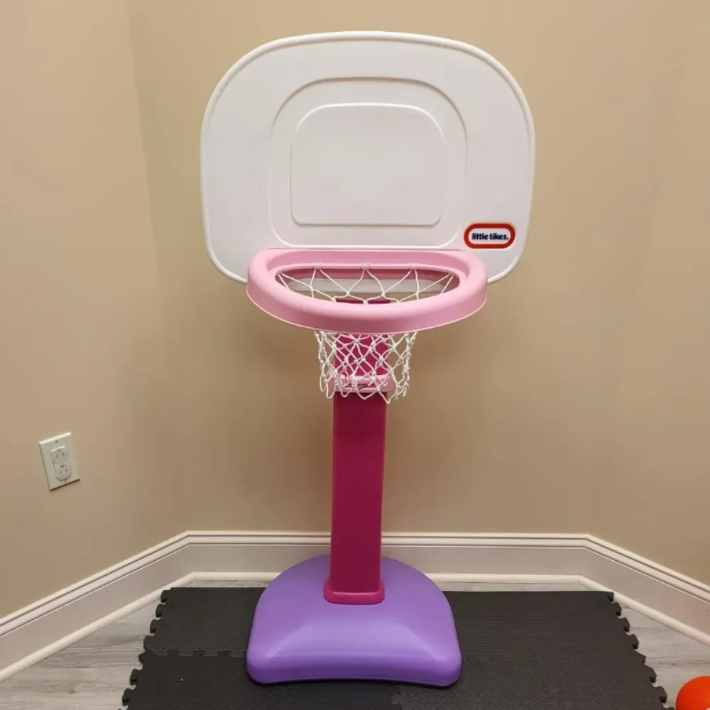 The Little Tikes basketball hoop is adjustable and can be set to different heights. It ranges from 2.5 to 4 feet in height, allowing children of various ages and sizes to enjoy the game. The hoop is designed with an oversized rim, making it easier for kids to score baskets and experience success as they develop their shooting skills.